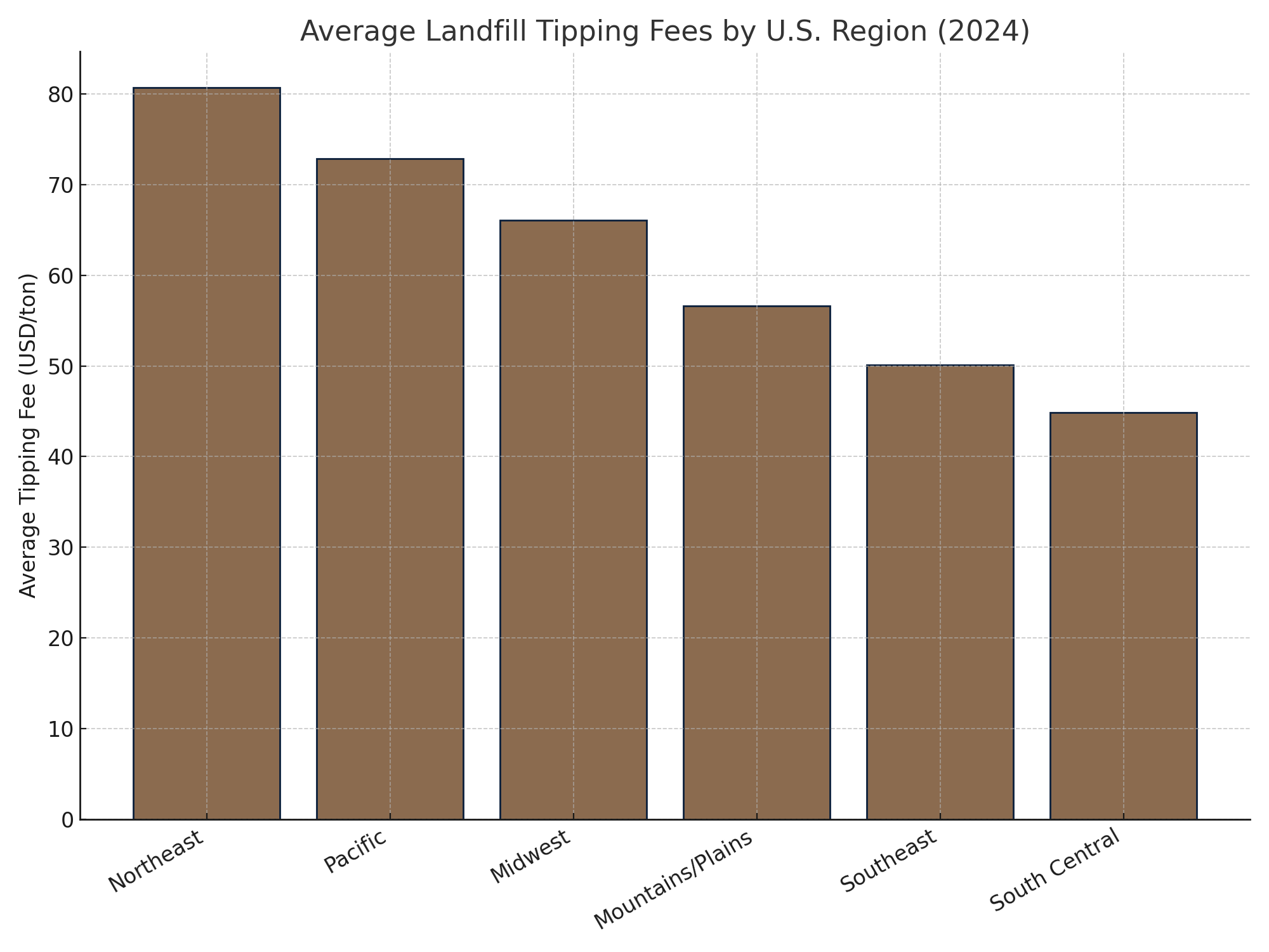 The Northeast continues to lead the nation with the highest landfill tipping fees, averaging $80.67 per ton, followed by the Pacific region at $72.88. At the other end of the spectrum, the South Central region (Arkansas, Louisiana, New Mexico, Oklahoma, Texas) averages just $44.87 per ton.